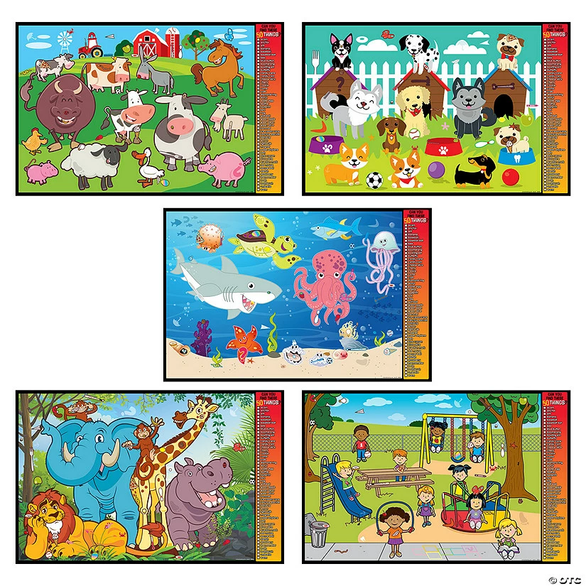 Keep kids engaged and entertained with these picture scavenger hunts! With five different themes, kids can choose one or all five! Test kids critical thinking skills as well as their observation skills and attention to detail all while they’re having fun! Themes include: farm, ocean, dogs, safari and recess. Paper. (50 pcs. per unit) 17″ x 11″ Assortment may vary. Β© OTC
