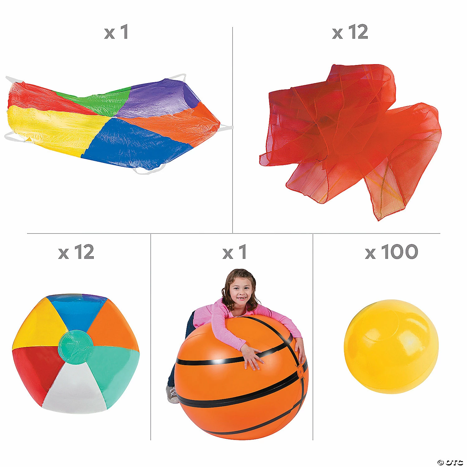 Take active play to new heights with this fun-filled kit! Set up multiple activities to get little ones moving at home, school, daycare or summer camps. Also makes great birthday party activities; just set these out and let party guests jump, bounce and laugh the day away. (126 pcs. per unit) Assortment may vary.Includes:β’ 1 Large Parachute (Includes durable handles. 20 ft.)β’ 100 Plastic Colorful Pit Balls (2 1/2″ 63mm)β’ 12 Nylon Easy-to-Juggle Scarves (14 1/4″)β’ 1 Vinyl Inflatable Sports Extra Large Basketball (Inflated, 30″)β’ 12 Vinyl Inflatable Classic Beach Balls (Inflated, 9″.)