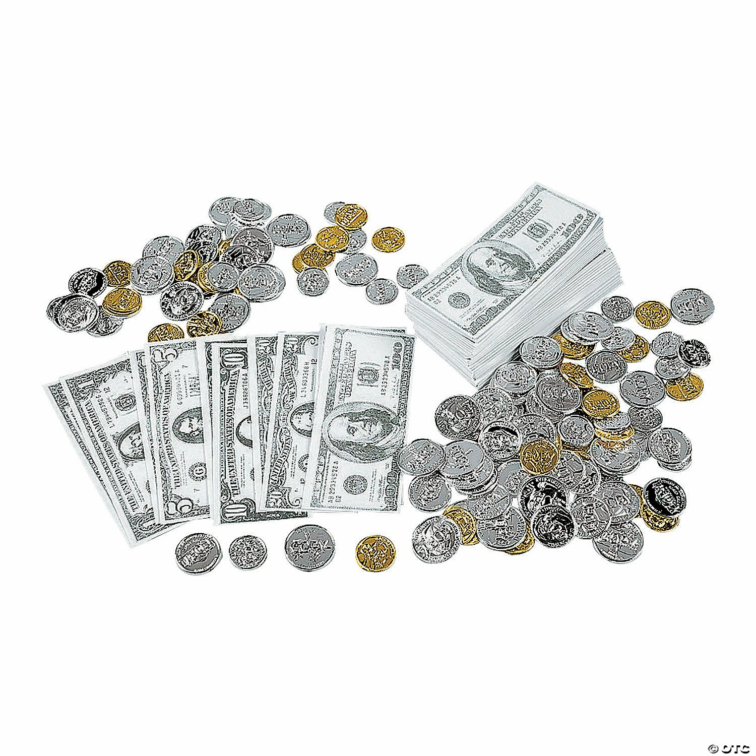 Letβs Play With Money Kit. Learn to count money and make change through play! Play store, practice counting money, make change for a fifty, teach coin counting and more! Includes paper bills in ones, fives, tens, twenties, fifties and hundreds. Plastic coins come in pennies, nickels, dimes and quarters. (1440 bills and 144 coins per unit) 3/4″ – 4″