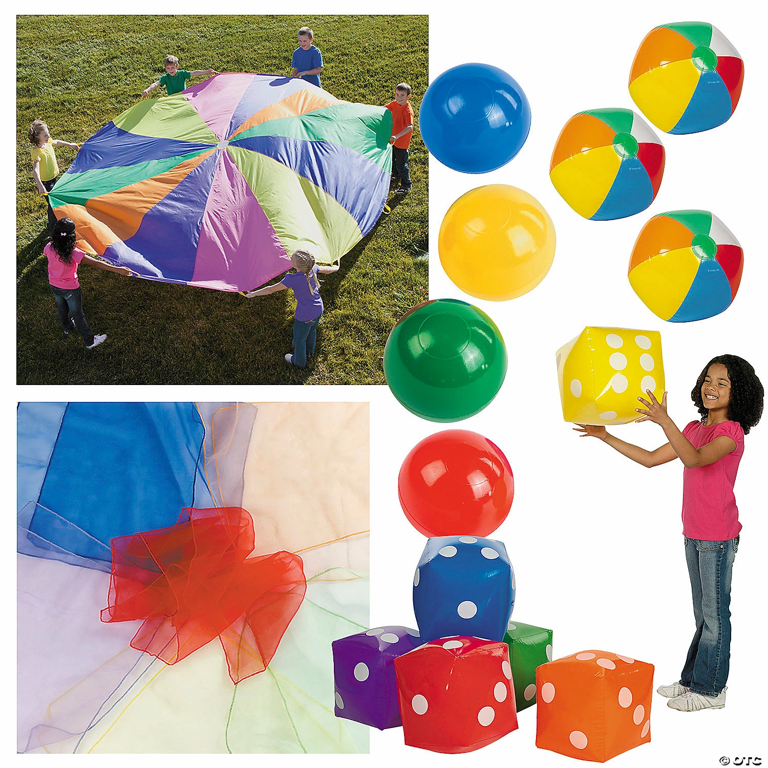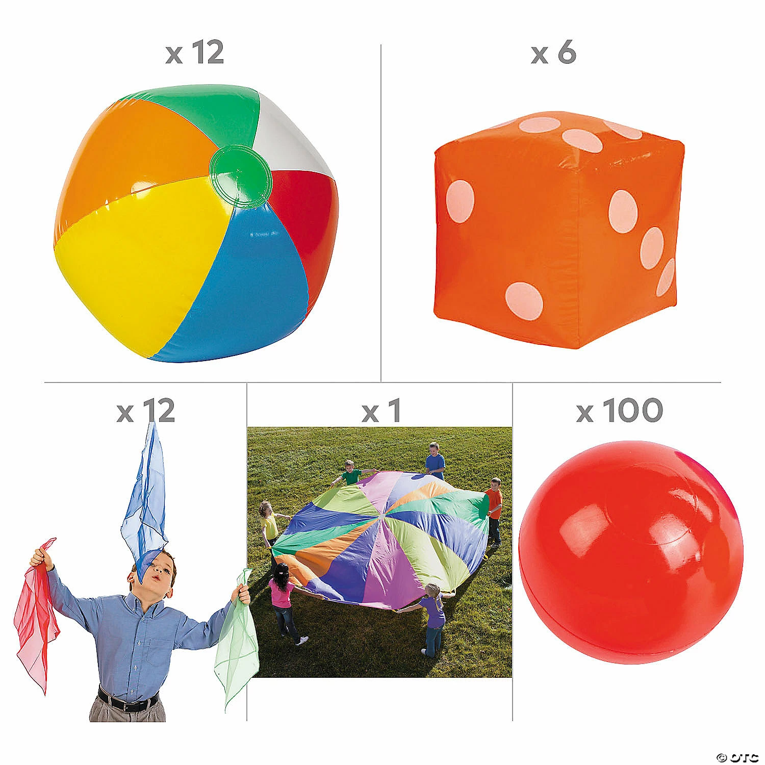 Get ready for some colorful and fun play time with this parachute kit! Parachute play is beneficial to kids because it involves physical movement, teamwork and hand-eye coordination. A great solution to indoor play in the classroom or at home, this kit has everything needed for some fun and active parachute play for kids. (131 pcs. per unit) Assortment may vary.Includes:β’ 1 Polyester Super Sturdy Parachute (12 ft. Includes durable nylon handles. Machine washable.)β’ 100 Plastic Colorful Pit Balls (2 1/3″)β’ 12 Nylon Easy-to-Juggle Scarves (14 1/4″)β’ 12 Vinyl Inflatable Classic Large Beach Balls (Inflated, 12″.)β’ 6 Vinyl Inflatable Dice Set (12″)