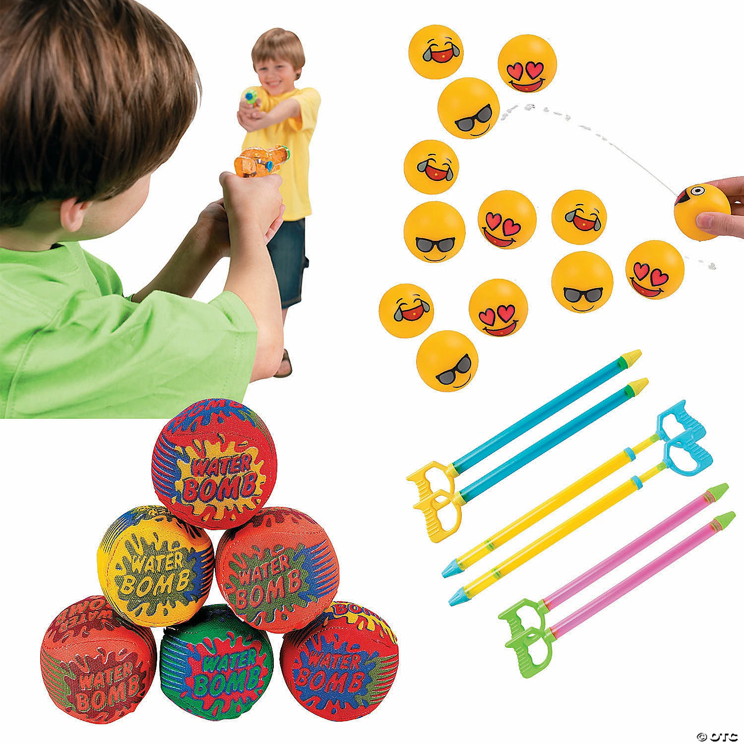 Who says itβs too hot to play outside? Add this fun water toy kit to your summer days for plenty of outdoor activity thatβll cool kids down on the hottest days. Have these water toys on hand for outdoor parties in the summer or use the toys as a way to get the kids outside to get them moving. A great choice for a day camp or youth group, these water toys will be a hit with kids! (42 pcs. per unit) Assortment may vary.Includes:β’ 12 Vinyl Emoji Squirts (2″)β’ 12 Plastic Neon Grip Squirt Guns (4″ x 4″)β’ 6 Plastic Tube Soaker Water Guns (19 1/2″)β’ 12 Nylon Water Bomb Soaker Balls (2 3/4″)