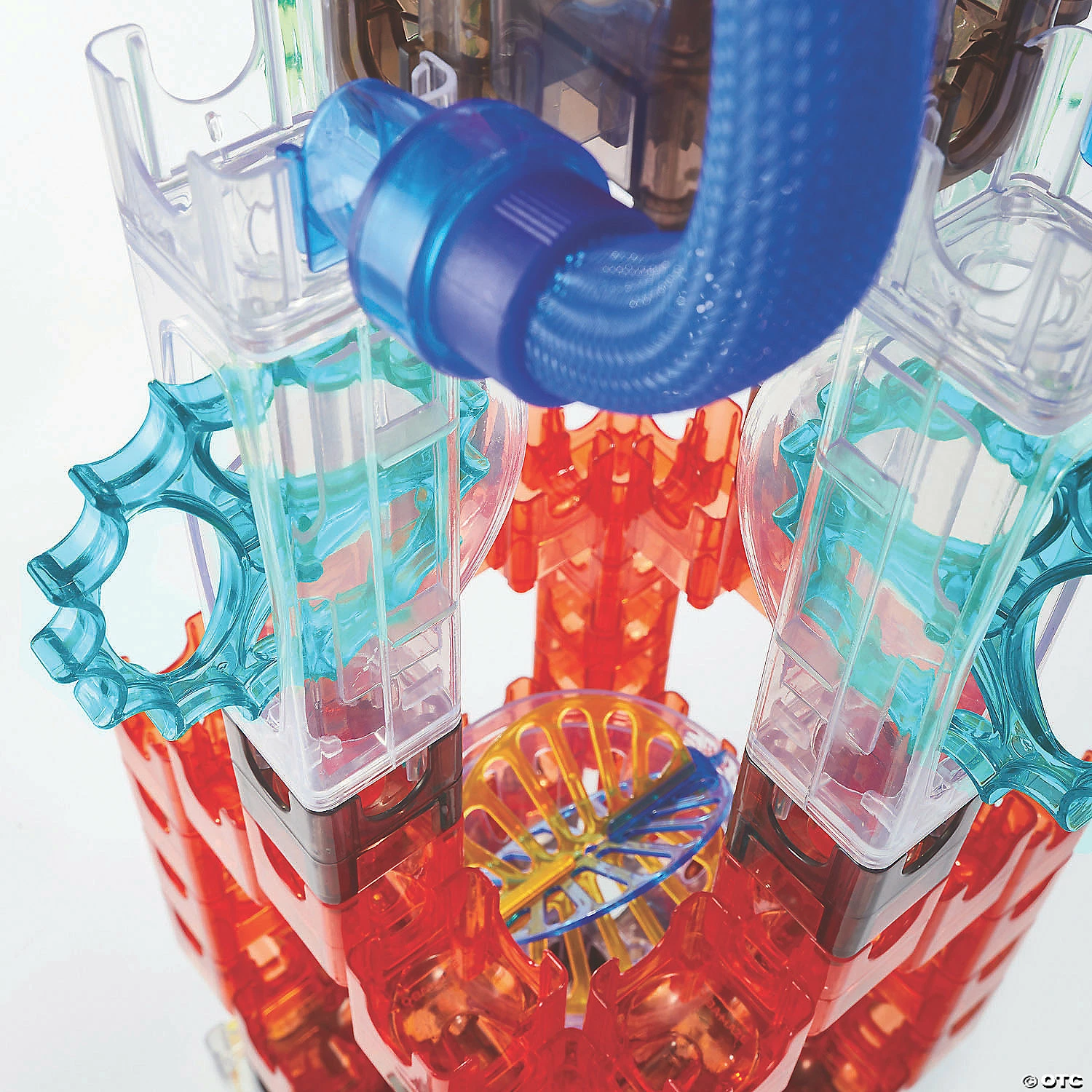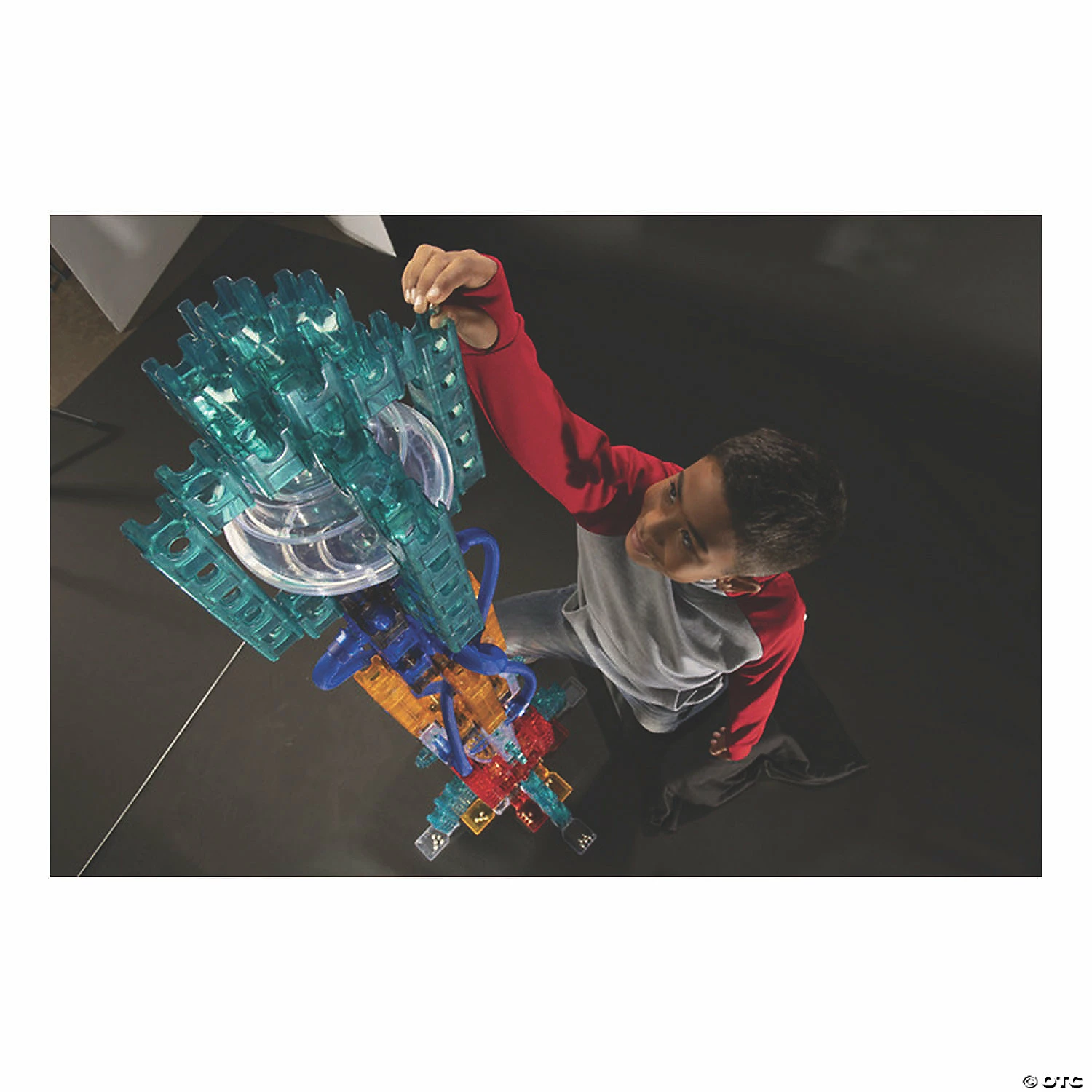 The Q-BA-MAZE Rocket Set of cosmic proportions with over 330 a-MAZE-ingly fun pieces: 4 light-up cubes, 4 speed sprockets, 4 coaster tubes, 4 cascade stilts, 1 roto catcher, 1 marble vortex, 1 spiral sphere, 16 marble catchers, and 262 colorful cubes.
