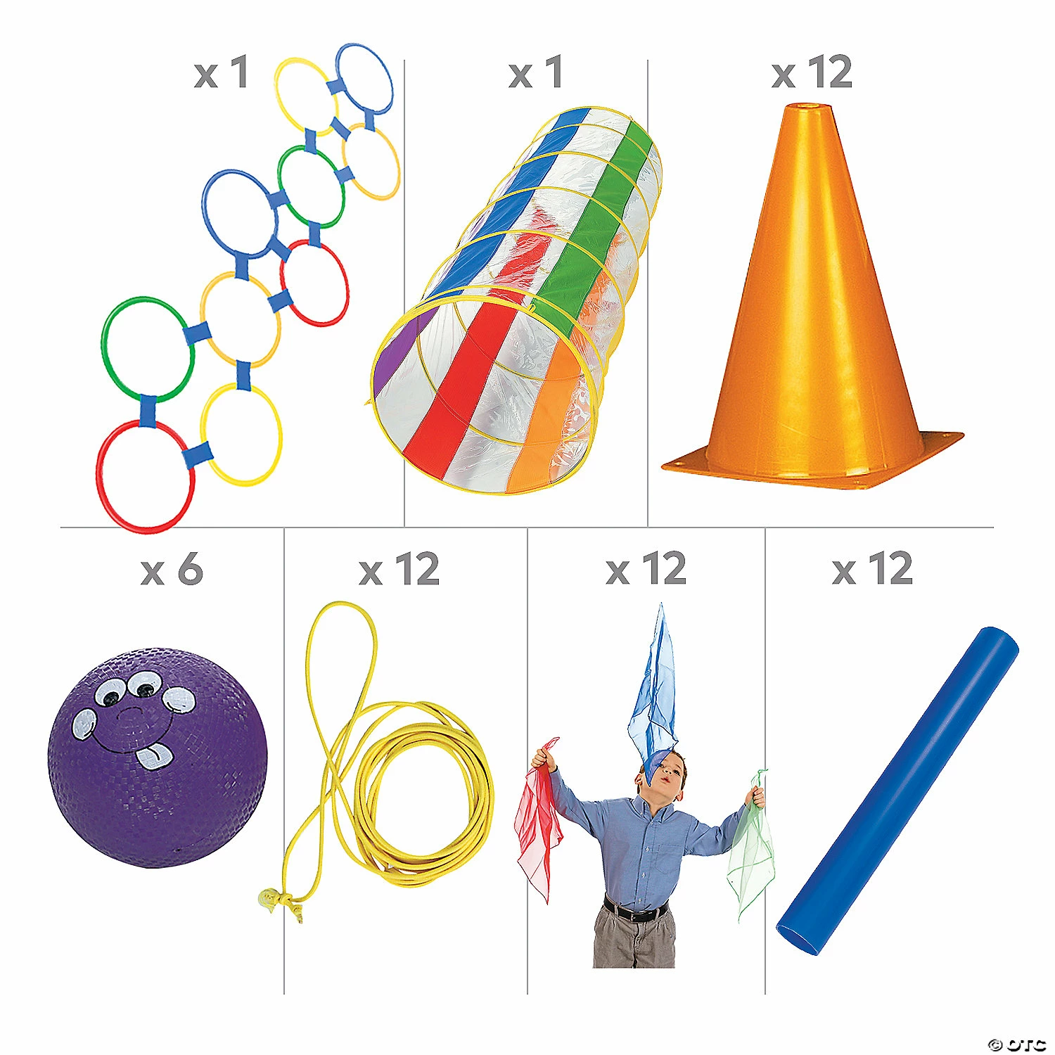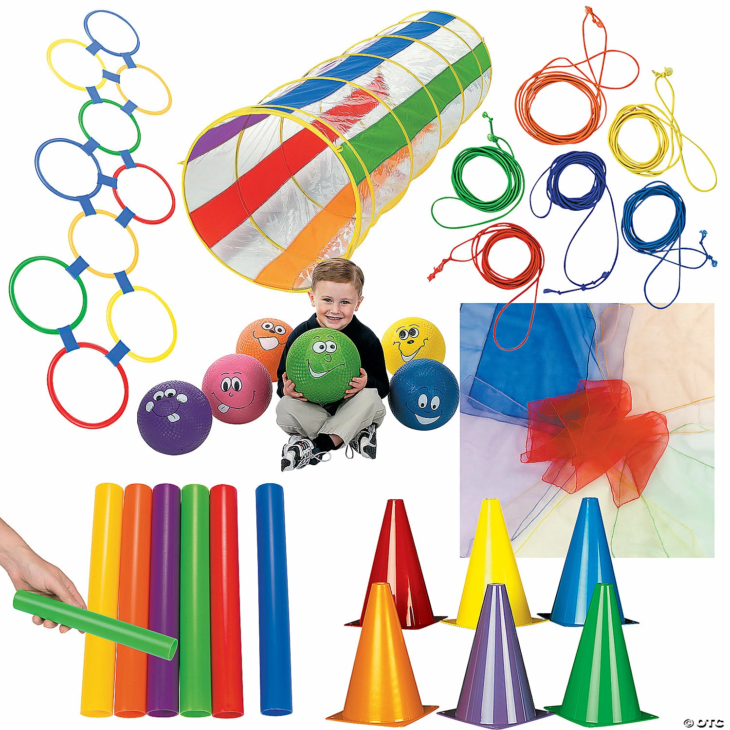 Get them up and moving with this active play kit for kids! Perfect for outdoor recess activities, this set is also ideal for activities in gym classes. With a variety of outdoor play tools, the game possibilities are endless! (74 pcs. per unit) Assortment may vary.Includes:โข 12 Nylon Chinese Jump Ropes (8 ft.)โข 6 Rubber Happy Face Playground Balls (Inflated, 8 1/2″.)โข 25-Pc. Plastic Hopscotch Ring Game (Includes ten 11″ rings with 15 attachments.)โข 12 Plastic Rainbow Relay Race Batons (10″ x 1″ diam.)โข 12 Nylon Easy-to-Juggle Scarves (14 1/4″)โข 1 Vinyl Clear I See You Tunnel (6 ft. x 21″ diam.)โข 12 Plastic Colorful Traffic Cones (5″ x 8 1/2″)