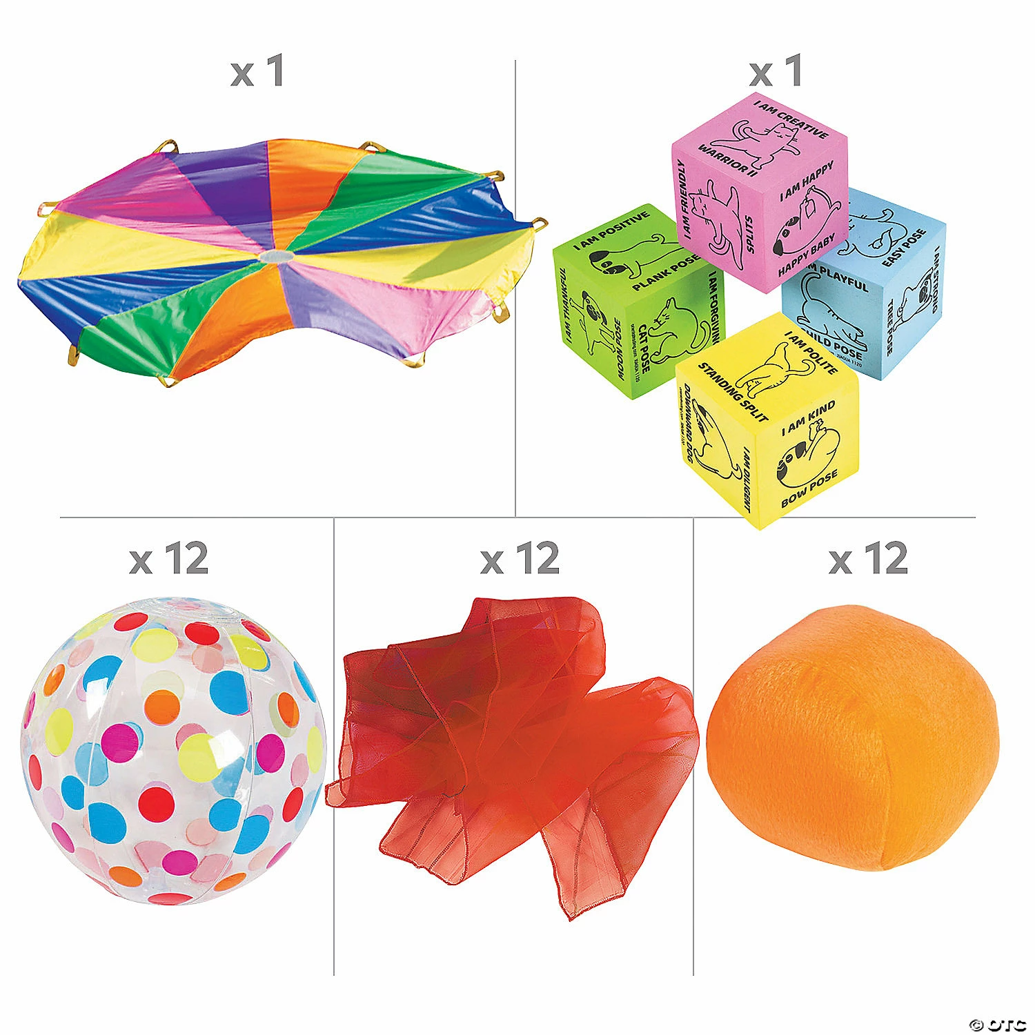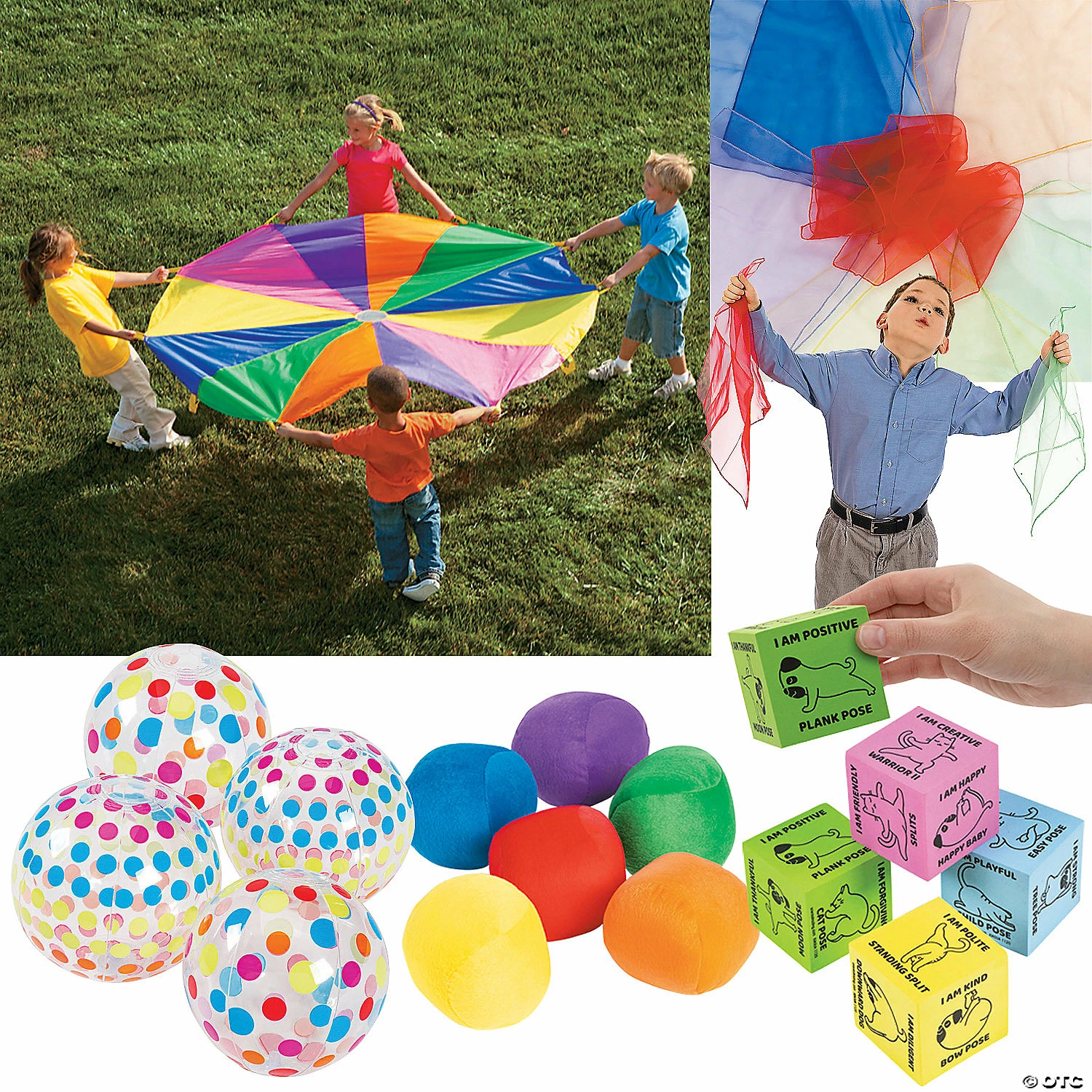 Get kids moving with this fun and colorful parachute kit. Featuring a parachute, balls, scarves and even yoga dice to get kids moving in creative ways, this kit is a great solution for indoor P.E. or active time in the classroom or at home. Parachute play requires teamwork and control β two things young kids can probably use some practice doing! (41 pcs. per unit) Assortment may vary.Includes:β’Β 1 Polyester Super Sturdy Parachute (6 ft. With nylon handles. Machine washable.)β’ 12 Nylon Easy-to-Juggle Scarves (14 1/4″)β’ 12 Vinyl Inflatable Polka Dot Mini Beach Balls (Inflated, 5″.)β’ 12 Colorful Plush Balls (4″)β’ 4 Foam Yoga Dice (2 1/2″ x 2 1/2″ x 2 1/2″)