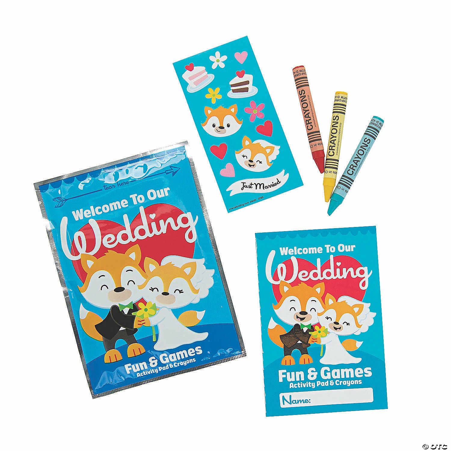 The kidsβ table at your wedding reception is about to be a flurry of activity! Have these cute, wedding-themed stationery sets available at the kidsβ table of a wedding reception or hand these out to kids before the actual ceremony. Full of puzzles and coloring pages, these stationery sets will make the day more special for your youngest guests. Each set includes an 8-pg. coloring book, one sticker sheet and three safe and non-toxic crayons in a 4″ x 5-1/2″ bag. Conforms to ASTM D-4236. Β© OTC