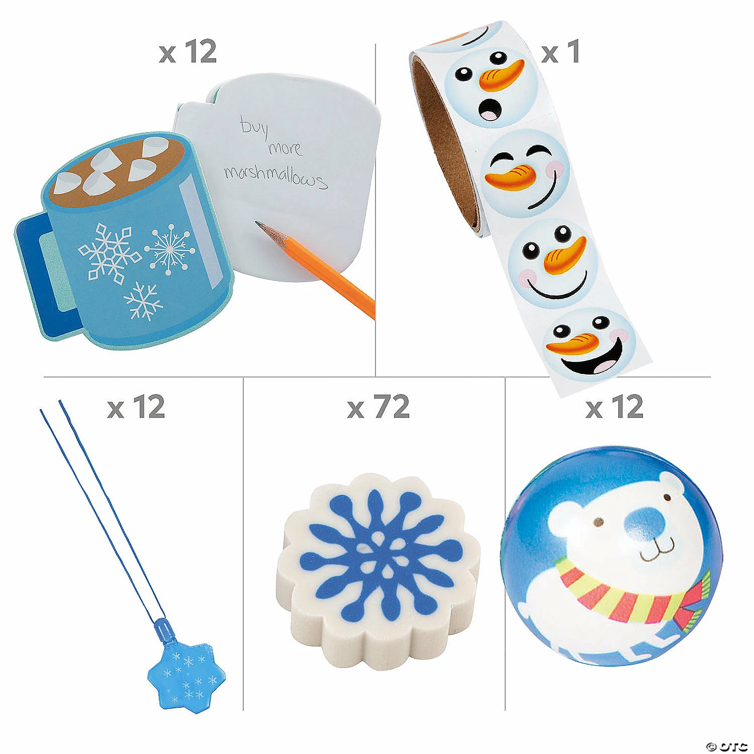 Fill your classroom reward box with a variety of winter-themed incentives students will love! Winter themed necklaces, erasers, stickers and more are all included in this fun incentive kit. Classroom rewards and giveaways will be highly sought-after by students and youβll notice great anticipation when it comes time to pull out the reward box! (109 pcs. per unit) Assortment may vary.Includes:β’ 12 Plastic Winter Snowflake Bubble Bottle Necklaces (Each .4-oz. bottle of bubbles includes attached wand. 2-1/4″ x 3-1/2″ on a 30″ cord.)β’ 72 Rubber Winter Snowflake Erasers (1″)β’ 1 Snowman Face Sticker Roll (100 pcs. per roll. 1 1/2″)β’ 12 Foam Winter Critter Stress Balls (2 1/2″)β’ 12 Hot Cocoa Notepads (4″ x 4″ 30 blank pgs.)